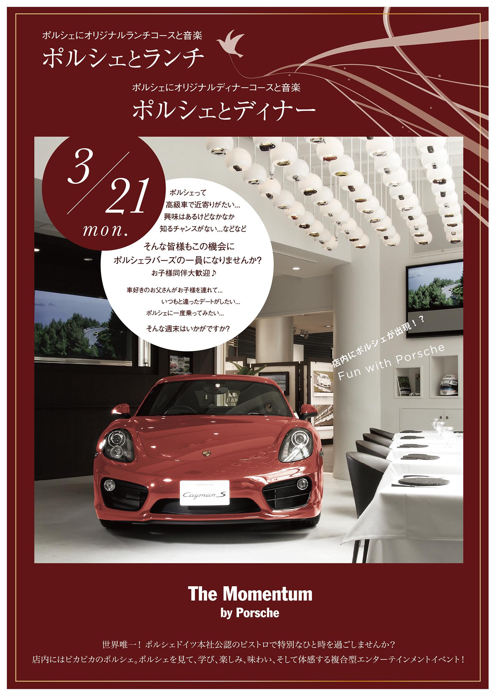 3月21日(月曜祝日)にランチとディナー2部制でポルシェ・エンターテイメントイベントを開催致します。