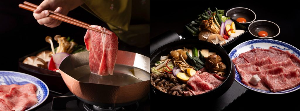 「すき焼き十二天」京都では、贅沢にスライスしたA5和牛を、すき焼きのほか、しゃぶしゃぶ・ビフテキ・オイル焼きなど多彩なスタイルでご堪能いただけます。さらに、好きなだけ和牛を楽しめる「食べ放題メニュー」も提供。